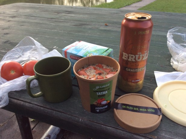 I reached Aluksne early evening. I had checked from various sources, that there is two campings near Aluksne. The town is nice with parks and historic sights, like a Livonian order castle ruins that I didn’t visit. Next time… Again, some shopping for the dinner and off we go to the camping. There was a nice old fellow, speaking some German, showing a place for a tent and asking if alles ist in Ordnung. And sure it was. There was a shower with warm water and at garden table to prepare the camping-gourmet dinner. Salad with tomatoes and cucumbers with mayonnaise for a starter, Estonian buckwheat dish with sausages and Polish cherries for a dinner.